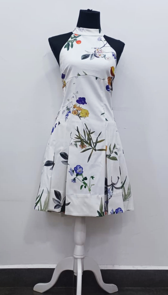 Bursting with characterful elegance, this midi dress boasts a sharp cut that is enlivened with an artful fruit and floral print, nodding to a whimsical summer mood.